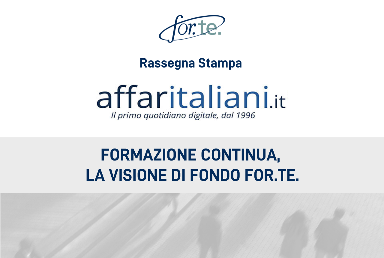 Formazione Continua, la visione di Fondo For.Te. Pubblicato il06/12/2022 Leggi l’articolo su affaritaliani.it Ascolta le pillole di Radio 24 17/01/202417/01/2024 Fondo Nuove Competenze: un meccanismo da rivedere 21/12/202321/12/2023 Ripensare la formazione per entrare nell’Europa delle competenze 23/11/202323/11/2023 L’IMPORTANZA DELLE RISORSE UMANE: FORMAZIONE CONTINUA COSì SI VINCE LA SFIDA ‘AI’ 13/11/202323/11/2023 Scatto in avanti delle imprese italiane sull’aggiornamento del personale 07/11/202323/11/2023 Fondo For.Te., “Dare forma al futuro”: II Forum sulla formazione continua 03/11/202323/11/2023