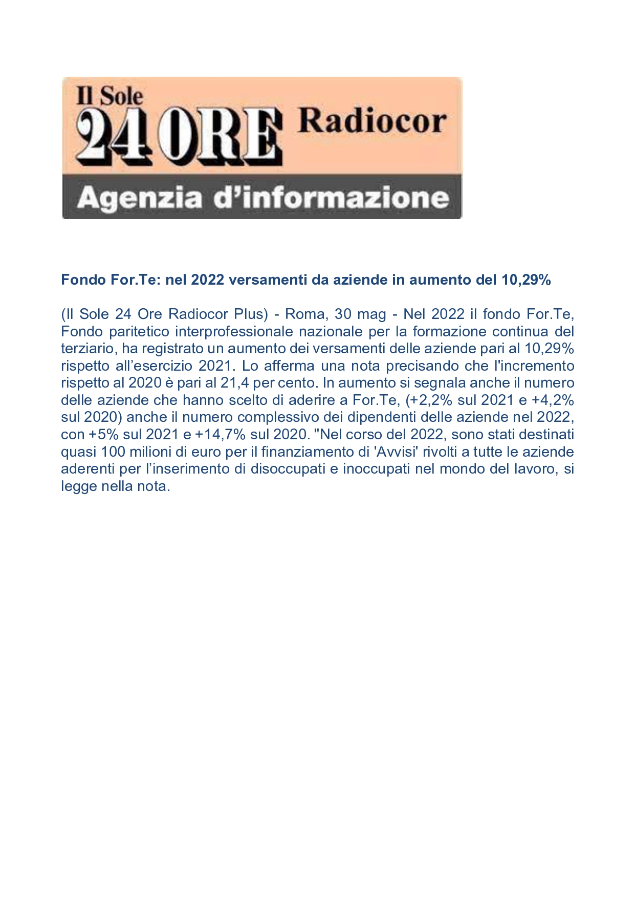 Fondo For.Te., nel 2022 versamenti da aziende in aumento del 10,29%