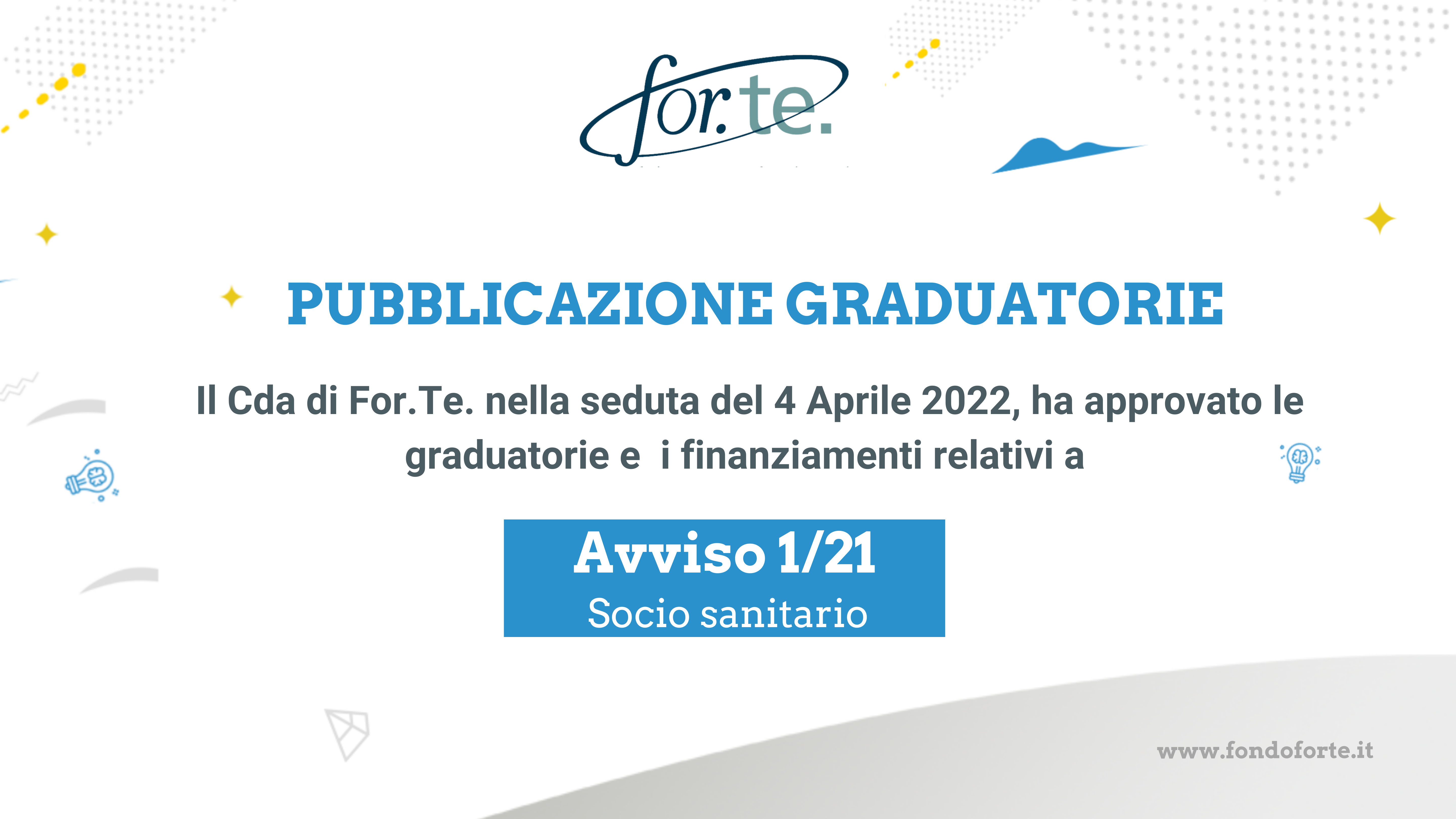 Si informa che in data odierna, 05/04/2022, sono state pubblicate le graduatorie relative all’Avviso 1/21.